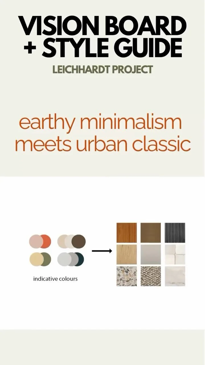 One of the most favourite parts of my job is the very first step! Asking clients about their style preferences and putting together a style guide showcasing a vision for their project highlighting colours and materials and inspirational images. I just love this board I prepared for my clients who wanted a minimalist and earthy scheme for their Inner West Terrace house in Sydney. Just wait till you see the finished product! Photos coming soon.#interiordesign #styleguide #minimalistinterior