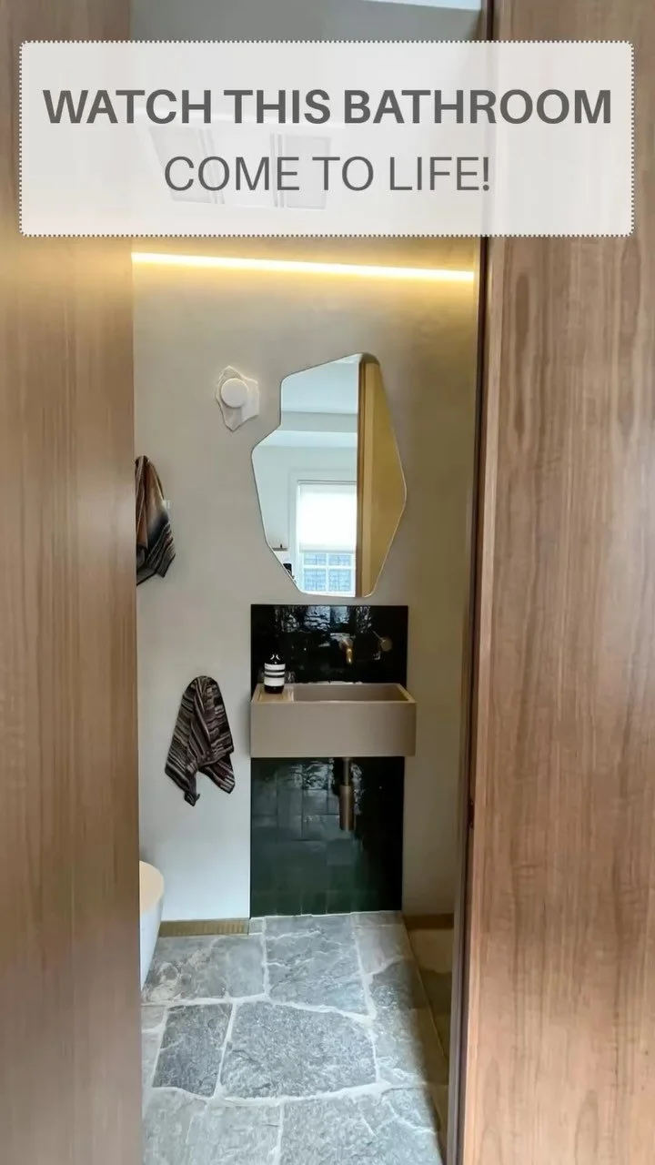 Watch this bathroom come to life! Hidden within a curved timber pod created to give my clients a much needed extra powder room, I pared back the materials here using microcement on all walls and the ceiling and crazy paving on the floors carried through from the kitchen area. The result is a serene additional bathing space!